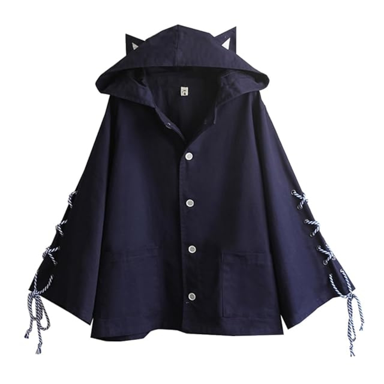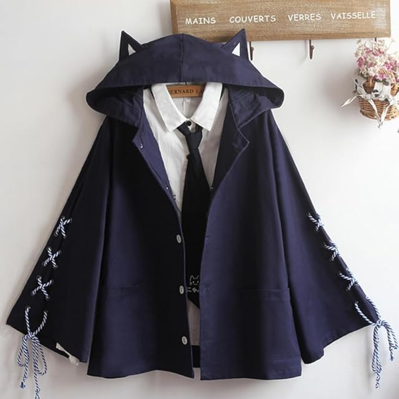 [WANSHIX] フード付き ジャケット レディース春 秋 マント ジップアップ アウター 原宿系 通学女子高校生 ポンチョ 防風 カジュアル ケープ 体型カバー 地雷系パーカー 猫絵付き ジャンパー 萌え(2XLDリボン)