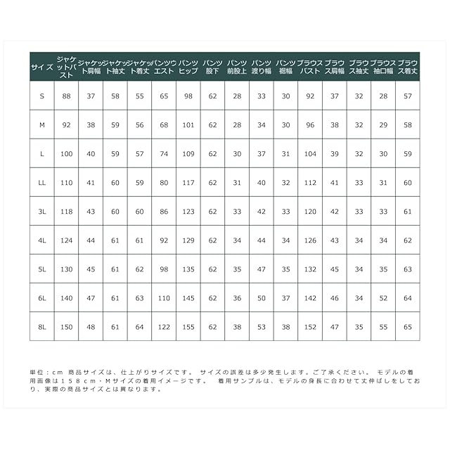 ◆これさえあれば通勤からハレの日までマルチに着回し◎お洒落ブラウス付でコーデ要らず☆大人気の3点セットスーツ!<br><br>■おすすめのスタイリング<br>・単品使い普段通勤からすっきりスーツスタイルの着回しは勿論、アクセアレンジで学校行事にも上品に着こなしていただける優等生◎<br>・1セットあるだけでオールシーズン大活躍すること間違いなしのこだわりお値打ち3点セットです。<br><br>【S】:ジャケットバスト:88、ジャケット肩幅:37、ジャケット袖丈:58、ジャケット着丈:55、パンツウエスト:65、パンツヒップ:98、パンツ股下:62、パンツ前股上:28、パンツ渡り幅:33、パンツ裾幅:30、ブラウスバスト:92、ブラウス肩幅:37、ブラウス袖丈:32、ブラウス袖口幅:28、ブラウス着丈:57<br>【M】:ジャケットバスト:92、ジャケット肩幅:38、ジャケット袖丈:59、ジャケット着丈:56、パンツウエスト:68、パンツヒップ:101、パンツ股下:62、パンツ前股上:28、パンツ渡り幅:34、パンツ裾幅:30、ブラウスバスト:96、ブラウス肩幅:38、ブラウス袖丈:32、ブラウス袖口幅:29、ブラウス着丈:58<br>【L】:ジャケットバスト:100、ジャケット肩幅:40、ジャケット袖丈:59、ジャケット着丈:57、パンツウエスト:74、パンツヒップ:109、パンツ股下:62、パンツ前股上:30、パンツ渡り幅:37、パンツ裾幅:31、ブラウスバスト:104、ブラウス肩幅:39、ブラウス袖丈:32、ブラウス袖口幅:30、ブラウス着丈:59<br>【LL】:ジャケットバスト:110、ジャケット肩幅:41、ジャケット袖丈:60、ジャケット着丈:59、パンツウエスト:80、パンツヒップ:117、パンツ股下:62、パンツ前股上:31、パンツ渡り幅:40、パンツ裾幅:32、ブラウスバスト:112、ブラウス肩幅:41、ブラウス袖丈:33、ブラウス袖口幅:31、ブラウス着丈:60<br>【3L】:ジャケットバスト:118、ジャケット肩幅:43、ジャケット袖丈:60、ジャケット着丈:60、パンツウエスト:86、パンツヒップ:123、パンツ股下:62、パンツ前股上:33、パンツ渡り幅:42、パンツ裾幅:33、ブラウスバスト:120、ブラウス肩幅:42、ブラウス袖丈:33、ブラウス袖口幅:33、ブラウス着丈:61<br>【4L】:ジャケットバスト:124、ジャケット肩幅:44、ジャケット袖丈:61、ジャケット着丈:61、パンツウエスト:92、パンツヒップ:129、パンツ股下:62、パンツ前股上:34、パンツ渡り幅:44、パンツ裾幅:34、ブラウスバスト:126、ブラウス肩幅:43、ブラウス袖丈:34、ブラウス袖口幅:34、ブラウス着丈:62<br>【5L】:ジャケットバスト:130、ジャケット肩幅:45、ジャケット袖丈:61、ジャケット着丈:62、パンツウエスト:98、パンツヒップ:135、パンツ股下:62、パンツ前股上:35、パンツ渡り幅:47、パンツ裾幅:35、ブラウスバスト:132、ブラウス肩幅:45、ブラウス袖丈:34、ブラウス袖口幅:35、ブラウス着丈:63