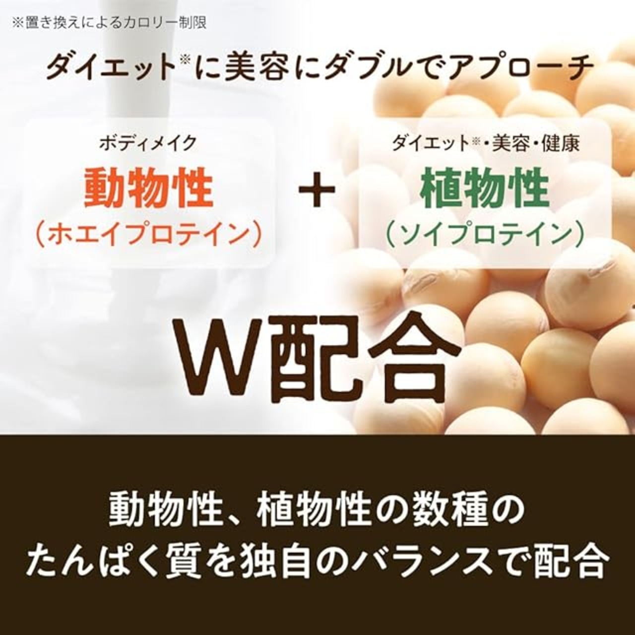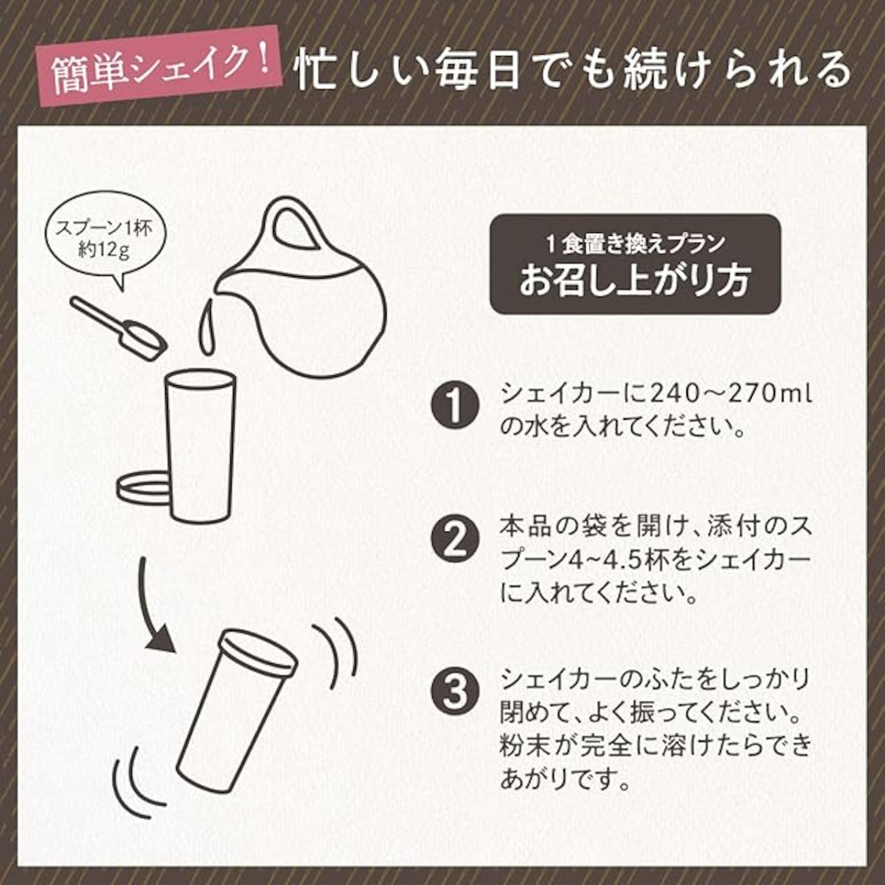 キャラメルとクリーミーなミルクが 絶妙なバランスで溶け合うカフェ風ラテ! 生乳生まれのキャラメルの香ばしく甘い香りが、 ほろ苦コーヒーとクリーミーなミルクに絡み合い、深い味わいに。 カフェで人気のあの味をダイエットでも楽しめる、 甘い香りに包まれた幸福感あふれる1杯です。 </br></br>《お召し上がり方》</br>【栄養補助プラン/約13回分】</br>添付のスプーン2~3杯を、約120~180mlの水に溶かしてお飲みください。</br>日頃の食事の栄養バランスが気になる方へ!</br></br>【1食置き換えプラン/約8回分】</br>添付のスプーン4~4.5杯を、約240~270mlの水に溶かしてお飲みください。</br>1回の食事に必要なたんぱく質、食物繊維、16種類のビタミン・ミネラルがバランス良く補えます。</br></br>※シェイクをつくるときは、水を入れてから本品を入れてください。</br>※やけどの危険があるため、シェイカーはお湯を入れて振らないでください。</br></br>アレルゲン情報:乳成分、大豆