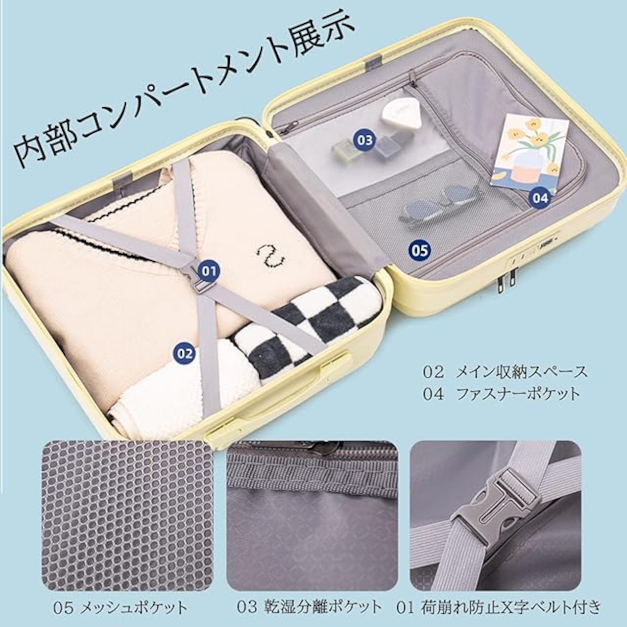 ✅【整理しやすい収納スペース】当商品はフロントオープン部分とメイン部分、二つ分けて収納できる。①フロントオープン部分:メッシュポケット1個(ジッパー付き)、pc収納ポケット1個。②メイン部分:荷崩れ防止X字ベルト固定収納スペース1個、ファスナー付きポケット1個、メッシュポケット1個(ジッパー付き)、乾湿分離ポケット1個(ジッパー付き)。荷物の整理がしやすく、スーツケースを開くことなくものの取り出すことができ、出張や資料の持ち運びなどビジネス用途から旅行まで、色々な場面で活躍できる!