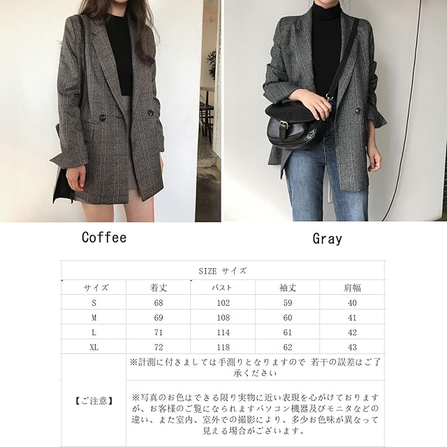 [safulsey] ジャケット レディース グレンチェック テーラードジャケット 裏地付き 薄手 春 夏 秋 ゆったり おしゃれ カジュアル チェック柄 大きいサイズ ミドル丈 ダブルボタン コート 韓国風 トップス 着痩せ ビジネス 通勤 オフィス (S, コーヒー色)