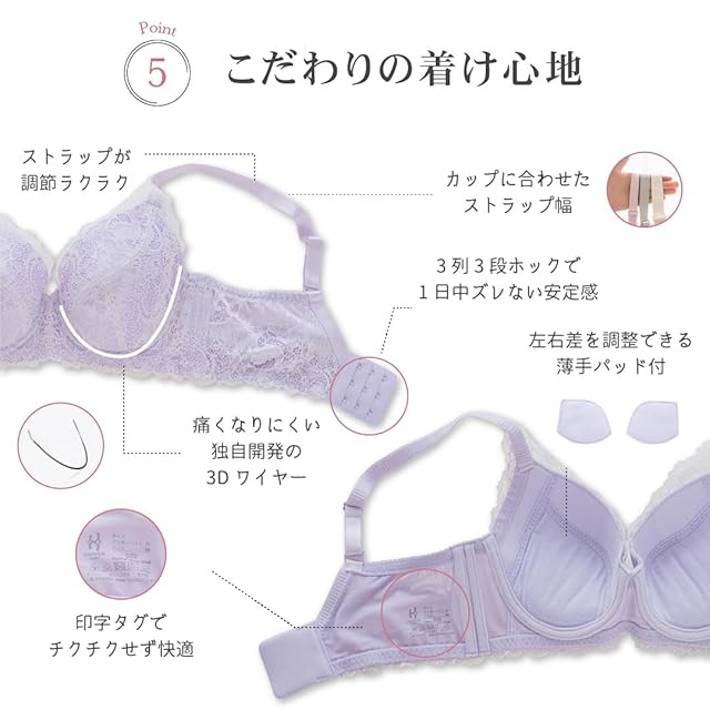 お肉を集めて逃がさない機能が非常に高いため、普段お使いのブラとサイズが異なる場合がございます。1カップアップをおすすめしております。