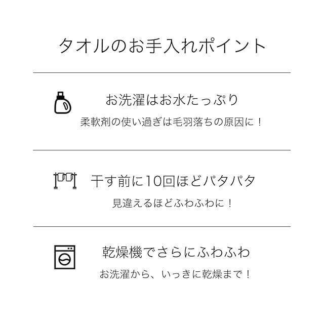 【毛羽落ちが少ない】:タオルに使用している綿は耐久性に優れており、お洗濯時の毛羽落ちが少ないのもおすすめポイントです。