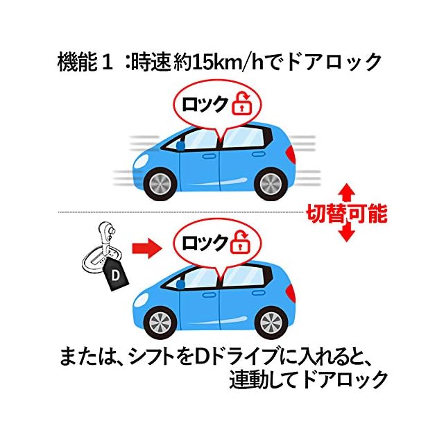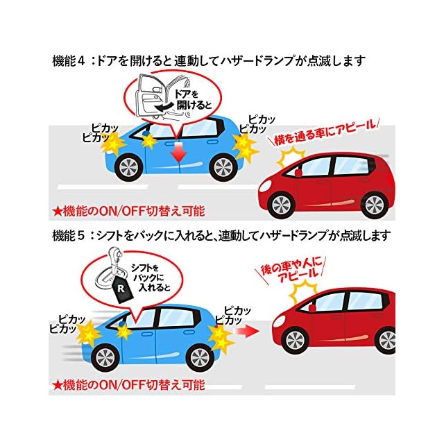 機能3.急ブレーキで自動でドアロック解除 (緊急回避のためロック解除されます)機能4.エンジンON中にドアを開けると自動でハザードランプが点滅します。 機能5.バック中(シフトをR)は自動でハザードランプが点滅します。 ドアオープン、バック中のハザード機能はON/OFFの切替可能です。※ハザードの点滅は最大40回の点滅します(ドアオープン時はエンジンON時のみ、ハザードが点滅します)
