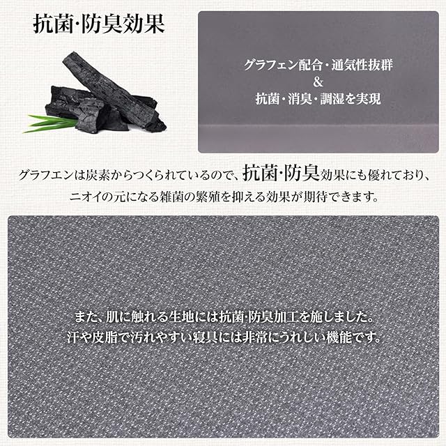 【グラフェン配合・通気性抜群&抗菌・消臭・調湿を実現】消臭効果のあるグラフェンをマットレス本体に練りこみました。万全のにおい対策で気になるにおいをしっかり消臭し、汗や皮脂の嫌な臭いを軽減します。それにグラフェンには消臭効果があるだけでなく、湿気の多い時には水分を吸収し、乾燥する時には水分を吐き出すという調湿効果もあります。だから安心して快眠できて、いつでも爽快な目覚めを!
