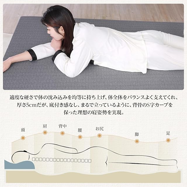 【高反発180N・30Dウレタンフォームを採用】理想的な180N・30D新世代高反発ウレタンフォームを採用、通常のマットレスより体圧分散効果はぐんとアップ!適度な硬さで体の沈み込みを均等に持ち上げ、体全体をバランスよく支えてくれ、厚さ5cmだが、底付き感なし、まるで立っているように、背骨のS字カーブを保った理想の寝姿勢を実現。※敷布団としてご使用中のベッドやたたみにそのまま敷いていただき、またご使用中のマットレスなどに重ねて、どんな使い方でも極上の寝心地が得られます。しかも軽量なので女性にでも軽々と運搬収納できます。