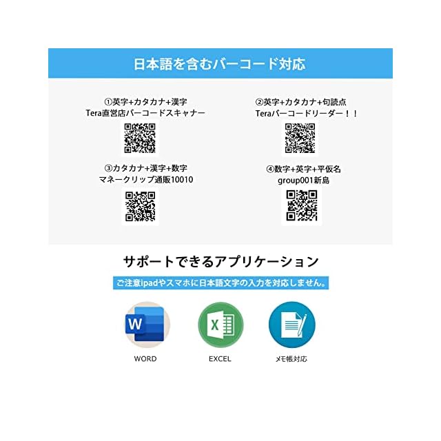 【日本語(漢字)を含むバーコード対応】--日本語(漢字、ひらがな、カタカナ)を含んだQRコードが文字化けせずに正しく読み取ります。エクセル、ワード等のアプリケーション上にキーボードと同じように入力します。