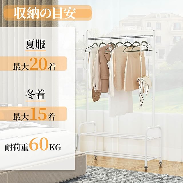 【多機能収納】:一台多役!多くの洋服だけでなく、バッグや帽子なども掛けられるし、下部にある棚には靴やスーツケースも置けます。