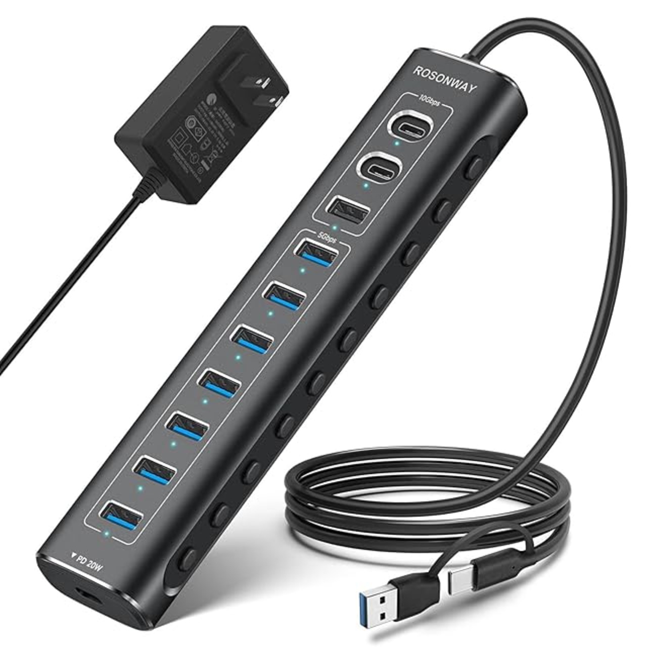ROSONWAY USB ハブ10Gbps 11ポート 20W PDx1 USB C 3.2x2 USB A 3.2x1 USB 3.0x7 2 in 1 ケーブル 付き アルミ製 USB HUB セルフパワーとバスパワー両用 12V 5A 電源 独立スイッチ付き(RSH-A11PD) | primer