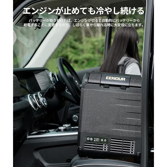 【バッテリー駆動でとごでも使える】別売りの専用バッテリーを取り付けると、庭、海辺やキャンプ場など電源のない場所でも使えます。大容量バッテリーなので、10時間以上連続駆動することができます。それに、停車時には自動的にバッテリー駆動に切り替わり、庫内を冷やし続けられます。ポータブル電源から引っ張る必要がないので使い勝手抜群です。また、ソーラーパネルより充電でき、電力不足の心配がありません。アウトドアでの長期滞在が可能になり、停電や災害の時にも役に立ちます。
