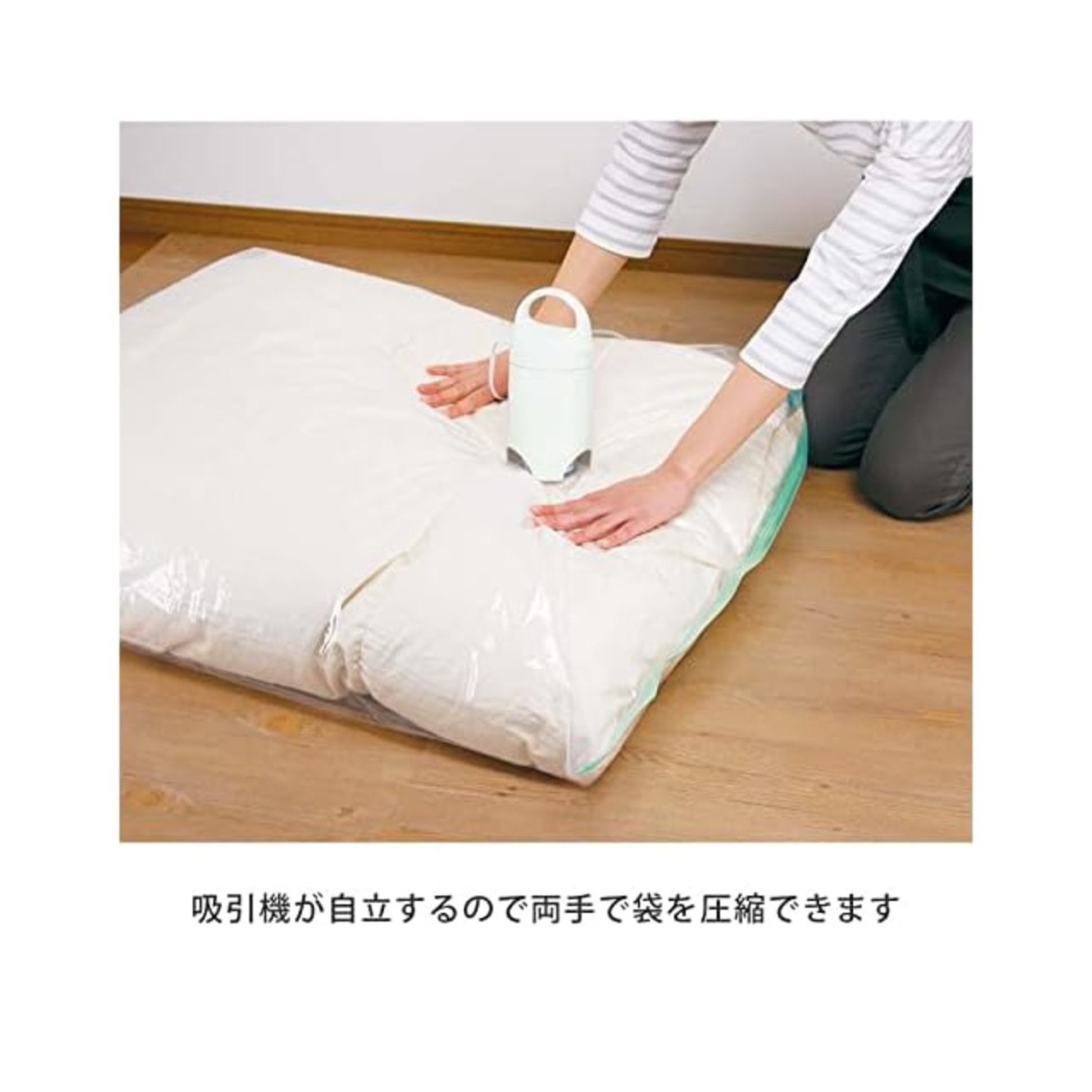 商品名掃除機の要らないふとん圧縮袋セット<br> セット内容電動吸引機エアッシュ、吸引機アダプタ(3点) 、布団圧縮袋Mサイズ(4枚)、LLサイズ(2枚) 、衣類用圧縮袋Mサイズ(2枚) 、防ダニシート(6枚)<br> サイズ電動吸引機(約)横10×奥行10×縦21cm、布団圧縮袋Mサイズ(約)横90×縦110cm<br> 布団圧縮袋LLサイズ(約)横150×縦100cm、衣類用圧縮袋(約)横40×縦50cm<br> 重量(約)800g(電動吸引機)<br> 材質電動吸引機:ABS、PC<br> 圧縮袋:ポリエチレン、ナイロン<br> バルブ:ポリエチレン、ポリプロピレン<br> エラストマースライダー:ポリプロピレン<br> 電源コード(長さ)(約)1.8m<br> 消費電力(約)270W<br> 電源/電力100V 50/60Hz<br> 生産国中国(防ダニシート:日本)