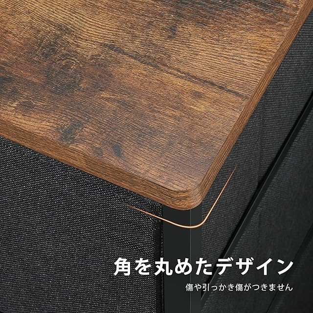【丈夫な天板と調節可能な足】 タンスの天板にはしっかりとした厚い木材を采用し、丈夫で耐久性があります。天板の丸い角の設計、刺し傷にはなりません、タンスは更にデザイン感があって、おしゃれに見えます。天板に鍵、コップ、花瓶、写真などが放置できます。地面が平らでない場合は、調節可能な足を使ってバランスを整えます。底には体重計の収納スペースもあります。
