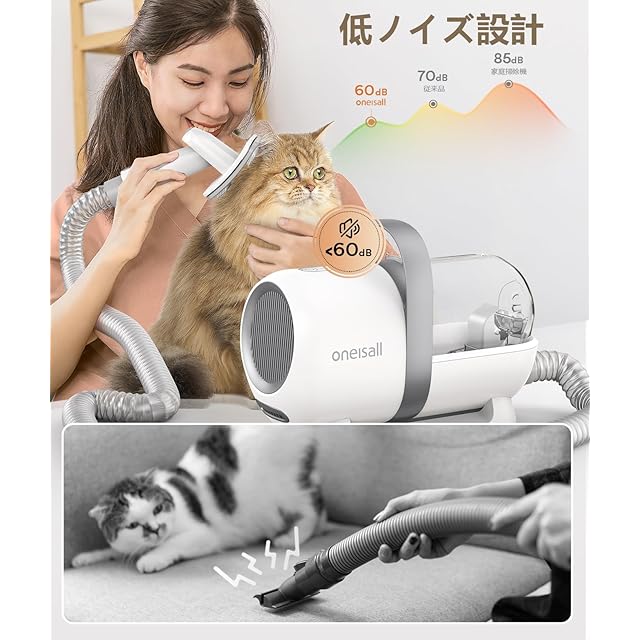 Oneisall LM5はペットの抜け毛対策に専念した設計で、ブラッシングと同時に、抜け毛などを簡単に吸い込むことができます。 二つの櫛によってペットの体の毛はもちろん、手足、眼鼻周辺、脇の下などの細部のケアもちゃんとできます。その他カーペットや服、ソファーなどの家具の掃除までできる一体化セットによって、いつも綺麗な家庭環境を提供できます。 最大10kPaの強吸引力で、あっという間に抜け毛や浮いた毛(死毛)を99%除去できます。またグルーミングブラシ、すきブラシ、クリーニングブラシ、吸い込みツールなどの部品で、犬猫にかからず、チワワ、ダックスフンド、ポメラニアン、柴犬、秋田犬などの体格もかからずきれいにブラッシングできます。 Oneisall LM5は、日本国内のPSE(電気用品安全法)認証を取り済み、製品の安全性と合規性を確保することができますので、どうぞご安心にご利用ください。弊社からお買い上げいただいた製品に対しては、商品に何らかのご不明がありましたら、どうぞいつでも気軽に連絡お願いします。