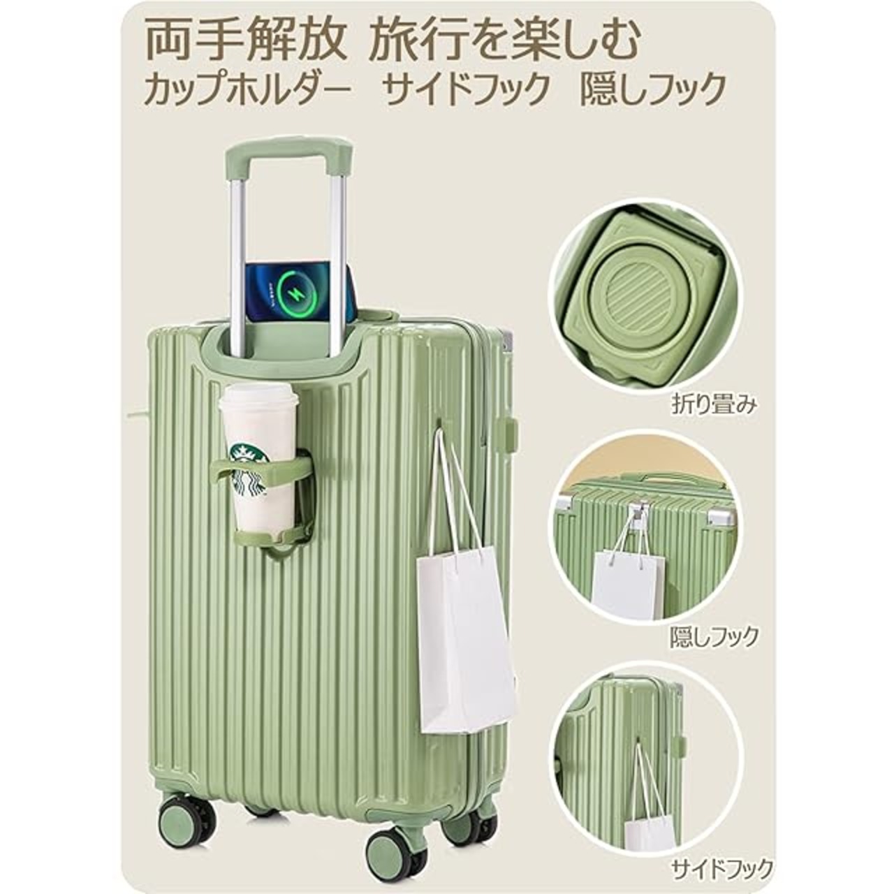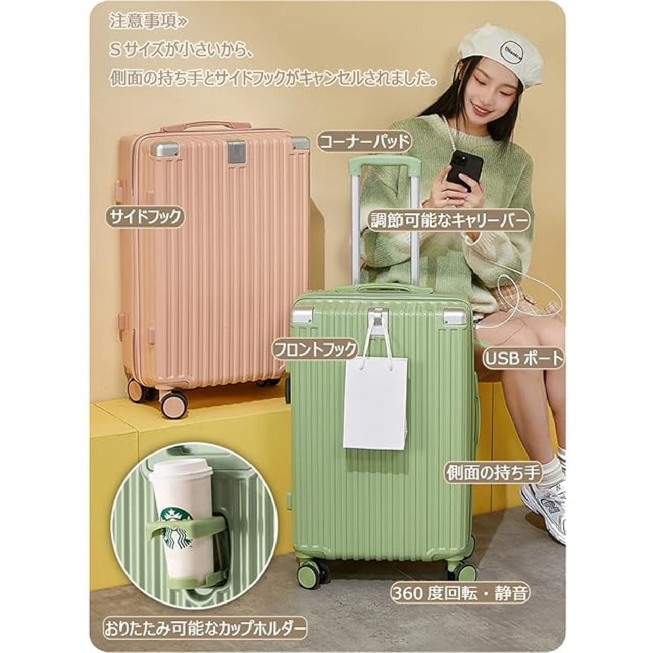 両手解放、旅行を楽しむ≫①隠しフロントフック②おりたたみ可能なカップホルダー③サイドフック が搭載されており、ドリンクやバッグなどを掛けて、旅行中の手への負担を軽減します。注意事項≫Sサイズが小さいから、側面の持ち手とサイドフックがキャンセルされました。