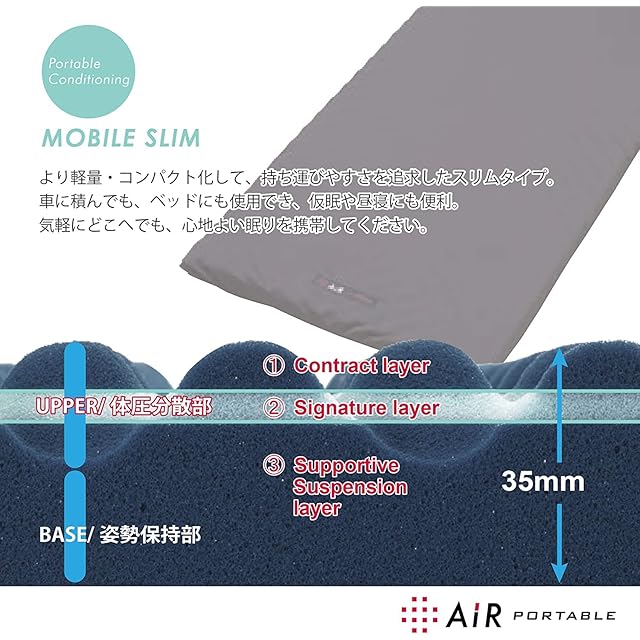 この1枚をプラスするだけで、[エアー]の機能性を発揮、快眠をサポートします。 軽量化、コンパクトにして、より持ち運びやすさを求めたスリムタイプ。