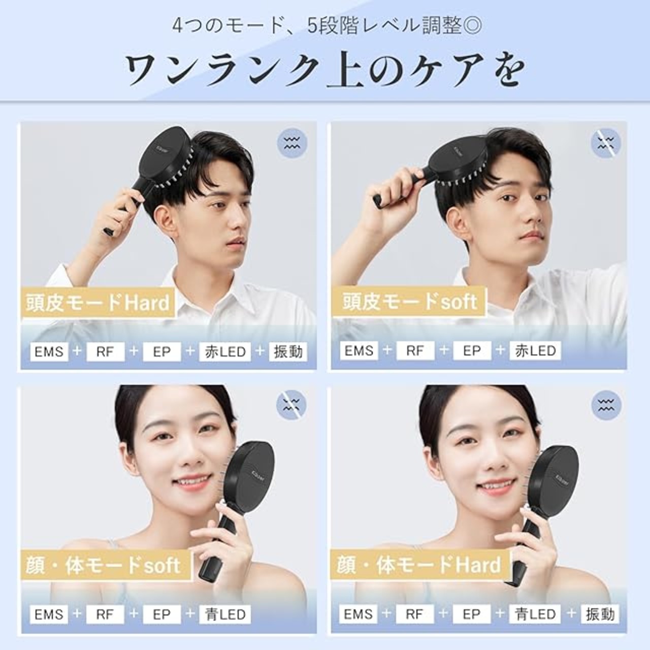 【5 in 1マルチ機能・一台多用】複数の機能を組み合わせでご自宅にいながら頭皮はもちろん、もたつきが気になるお顔や体にもトータルケアできます。for頭皮:すっきりした頭皮へ。for顔 :キュッと上向きの肌に。4つのモード、5段階レベル細かい調整可◎お好みに合わせて細かいレベル調整が可能に!ワンランク上を目指す方にKiboer電気ブラシをおすすめ!