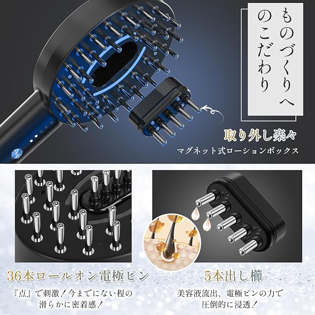 【2種類のピン】独自の36本ロールオン電極ピン『点』で刺激!今までにない程の滑らかに密着感。エステのドレナージュの動きを再現!中央の5本出し櫛は、ケアしながら美容液などの流しは可能で、電極ピンとの組み合わせで、育毛剤などをしっかり頭皮に伝達!美容液がもつ効果をより発揮させることが出来ます。また、マグネット式のローションボックスで取り外し楽々、丸洗いでき、いつでも衛生に。