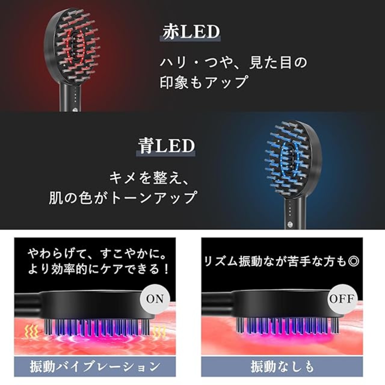 【本格光エステ】エステサロンでも人気の「赤・青LED」を搭載。光トリートメントで肌を健やかに整え、キメのあるクリアな肌に導きます。18000回/分の心地よい振動でやわらげて、すこやかに、いきいきとした健やかな頭皮へ導いていきます。振動が自由に制御可能で、敏感肌や振動音に苦手な方などにもおすすめします。