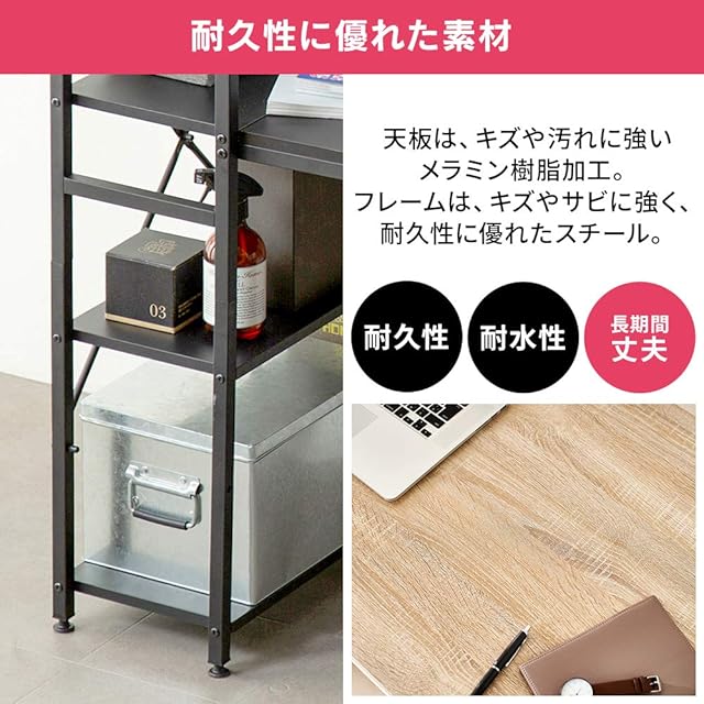 材質 天板・棚板:合成樹脂化粧パーティクルボード(メラミン樹脂)、フレーム:スチール(エポキシ粉体塗装)