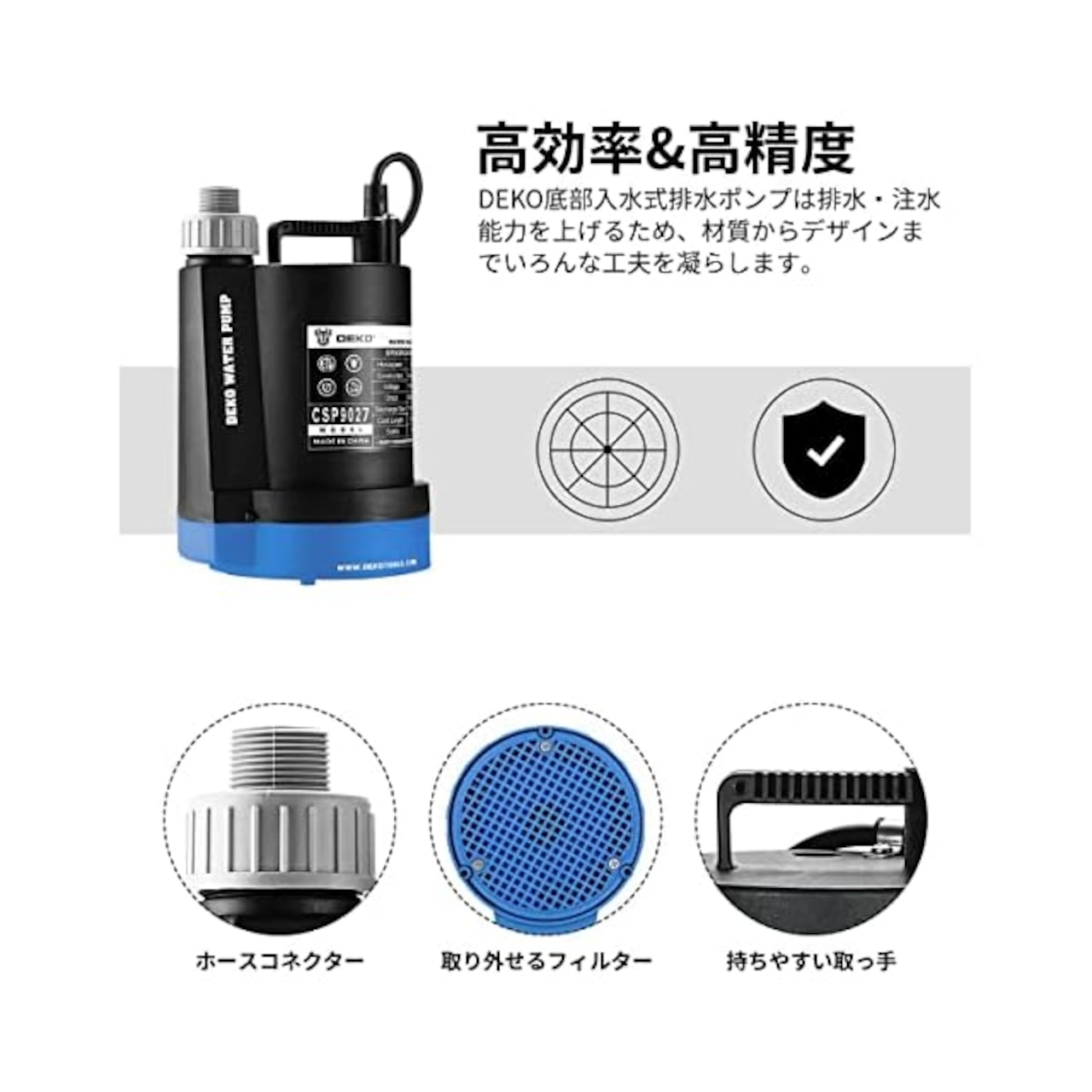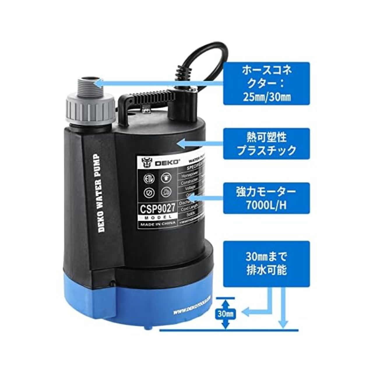 ⛽【強力な汚水ポンプ】DEKO家庭用水中ポンプはプロ仕様の1/4強力モーターを採用し、最大吐出量は7000L/H、最大揚程は8mに達し、素早く排水できます。また、循環ポンプのフィルターは3㎜の固形物をより効率的に処理し、排水・給水効率を更にアップします。