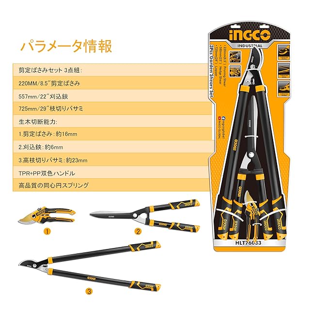 INGCO 園芸剪定鋏 3点組 220MM/8.5"剪定ばさみ 557mm/22"刈込鋏 725mm/29"高枝切りバサミ 果樹の剪定 庭の剪定 木の剪定 盆栽の剪定 HLT76033 | primer