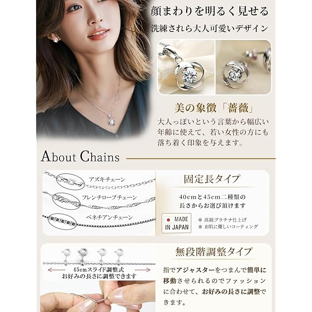【上品なデザイン】 バラは愛と美、喜びの象徴です。スワロフスキージルコニアを使った薔薇モチーフのレディスネックレスは日常使いしやすい、上品なデザインでギフトにもぴったりです。キラリと光る一粒のスワロフスキージルコニアが上品でありながら、かわいらしさに華やかさを添えたデザインで、美しい石が貴女の胸元で美しく輝きます。 優美な曲線が描くバラの輪郭がとても美しいモチーフペンダントの仕上がり、魅力あふれるローズモチーフの大人色レディースネックレスです。シンプルなデザインなのでプチジュエリー的なアクセサリーとして普段使いにも是非オススメなレディースネックレス。 シルバーのネックレスレディースは柔らかな輝きも美しく、シンプルながらも可憐な印象に。