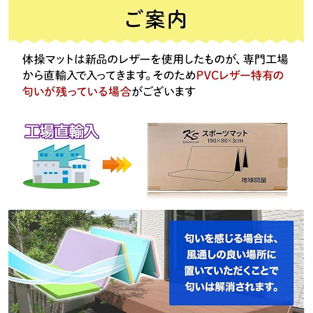 【サイズ/重量】190cm×80cm×3cm(折り畳み時:80cm×38cm×15cm)、重量:約2.0kg 【素材/材質】マット;EPE、カバー;PVCレザー 【カラー】ブラック、ブルー、ベージュ、グリーン、パープル、ブラウン、アクアブルー、グレージュ、オレンジ、イエロー、カラフル、パステル 【セット内容】折りたたみマット単品