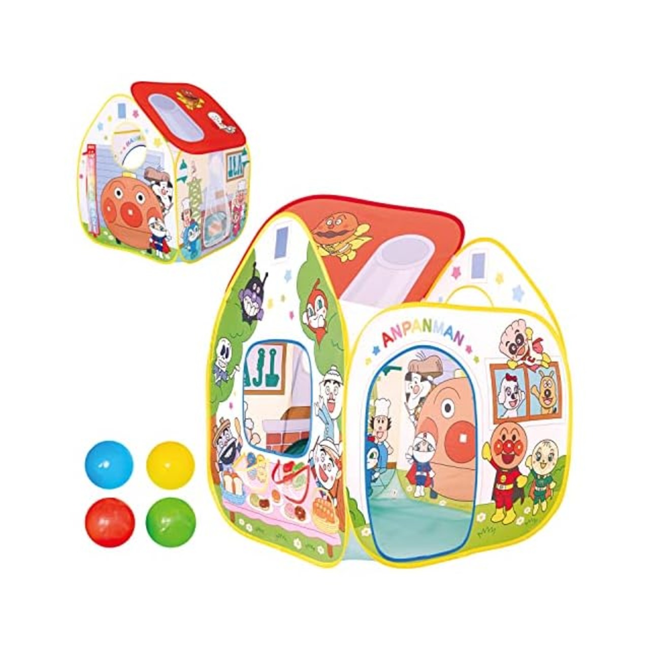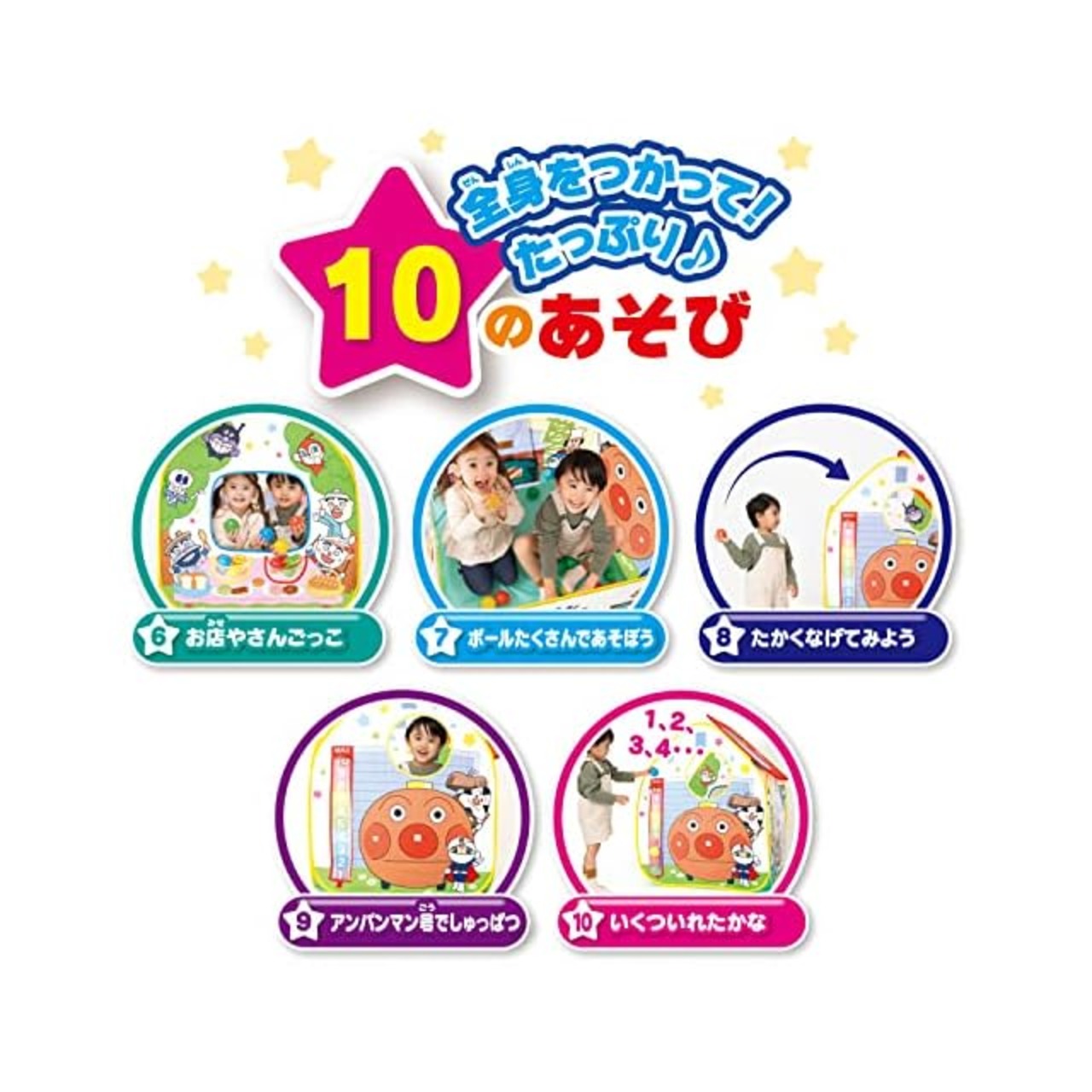 アンパンマンとなかまたちがいっぱいの楽しいデザインのボールテントで、ボール遊びやお店やさんごっこなど、全身を使った10のあそびが楽しめます。