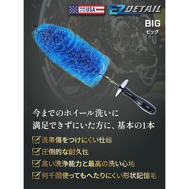 【プロ仕様】EZ Detailブラシ(イージーディテールブラシ)は、ホイールの隙間や手の届きにくい部分の洗浄に最適。特殊形状の毛材で、ホイール表面に傷をつけずに汚れをしっかり除去できます。ホイール洗車に欠かせない洗車ホイールブラシ。【ビッグサイズ】大口径ホイールや奥行きのあるホイールの洗浄にも対応。ビッグブラシ(直径10.2cm × 長さ45.7cm)は、ホイールの奥までしっかり届き、効率的に洗浄可能。さらに、エンジンルームやグリル、マフラー周りなどのクリーニングにも対応。1本で幅広い用途に使えるホイール洗車ブラシ。【形状記憶毛材Nylex】特殊ナイレックス(Nylex)繊維を採用し、繰り返し使用しても元の形に戻る耐久性抜群の洗車ブラシ ホイール用。毛先は適度な柔らかさを保ちつつ、ホイールの頑固なブレーキダストや汚れをしっかり除去。長期間愛用できる高品質設計。【ホイールを傷つけない安全設計】EZディテールブラシは、強化ビニールコーティングされた軸と先端キャップを採用し、ホイールやリムを傷つけにくい安全設計。ホイールのスポーク間やナットホールの汚れをしっかり落としながら、繊細なホイールの仕上がりを守る。【柔らかさと洗浄力のバランス】柔軟性のあるブラシ繊維が、ホイールの隙間や細部まで入り込み、優しく洗浄しながらも、頑固なブレーキダストや汚れをしっかり除去。洗車 ホイールブラシ おすすめの1本! 高級ホイールの手入れにも安心して使用可能。
