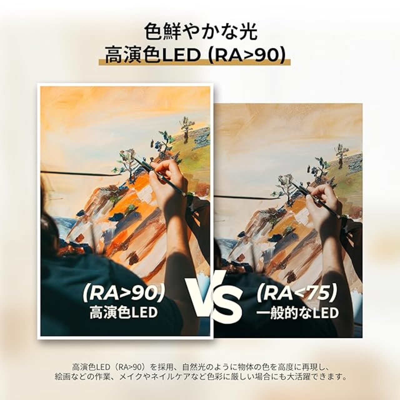 【3段階調色・4段階調光・メモリ機能・JIS規格-AA形相当・高演色性】①明るさが最大1363ルーメンとなり、色温度(2700K/4000K/6500K)と明るさ(15%/50%/75%/100%)をタッチセンサーだけで自由に組み合わせして、読書や細かい作業など様々なシーンに活躍できます。②メモリー機能も搭載し、お好みの明るさや色温度が記憶されるため、使うたびに再調整が不要です。③高演色LED(Ra>90)を採用、自然光のように物体の色を高度に再現し、絵画などの作業、メイクやネイルケアなど色彩が気になる活用シーンにも大活躍できます。
