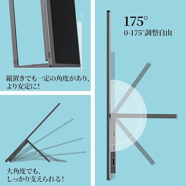 【自立スタンド付き・VESA対応】自立スタンド付きで、0°~175°の範囲内に自由調整可能!固定力十分だから、「大角度なら倒れるかも?」って心配もなく!縦置きでも一定の角度を付けており、倒れるリスクを最大限無くす!そのうえ、底部の滑り止めゴムは四つも!自体はもう十分安定なのに、VESAまで対応可能!安定感重視ならまさにこの品一択しかないと言えるだろう!