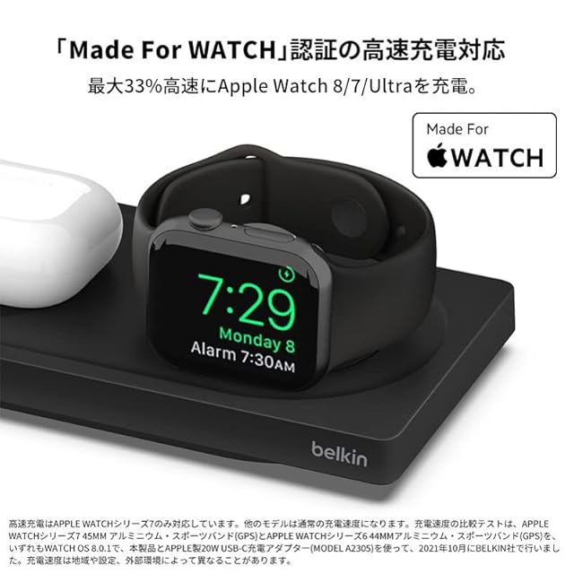 【あなたの空間を格上げする充電器】BelkinのMagsafe対応ワイヤレス充電器WIZ016は、iPhone 16 / 15 /14/13/12やApple Watch 8/7/Ultra、AirPodsなどのデバイスの充電をしているだけなのに、まるでおしゃれなインテリアのようになるスタイリッシュなデザインのワイヤレス充電器です。ナイトスタンドモードに対応し目覚まし時計としても使うことができ、Apple Watchを平らに寝かせることも可能。充電モジュールは、どちらの向きでも使用できるように上げることができます。シンプルかつ高機能で、使い方はあなた次第です。