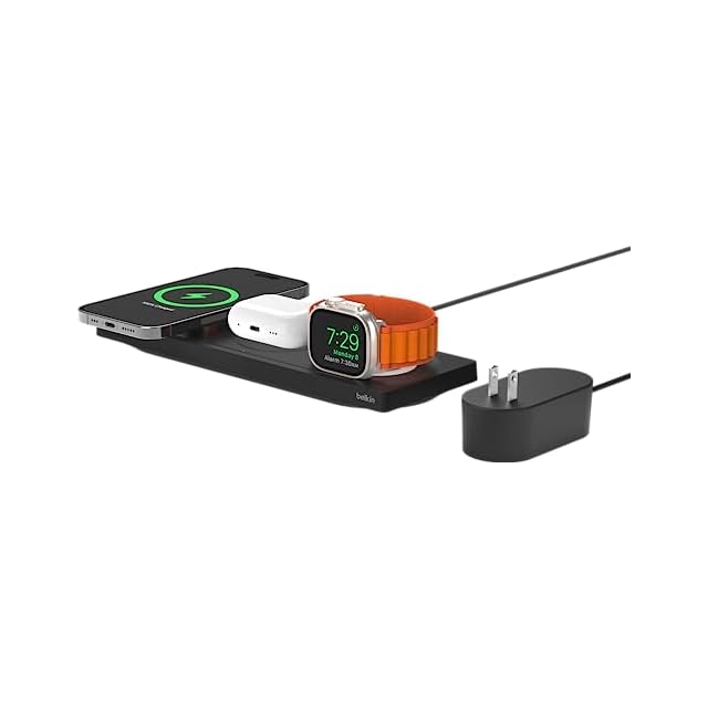 Belkin[Apple公認] 3 in 1 MagSafe充電器 最大15W高速充電 ワイヤレス充電器 MagSafe公式認証 iPhone 16 / 15 / 14 / 13 / 12 Apple Watch 8/7/Ultra 高速充電対応 AirPodsワイヤレス充電対応 ブラック WIZ016dqBK | primer