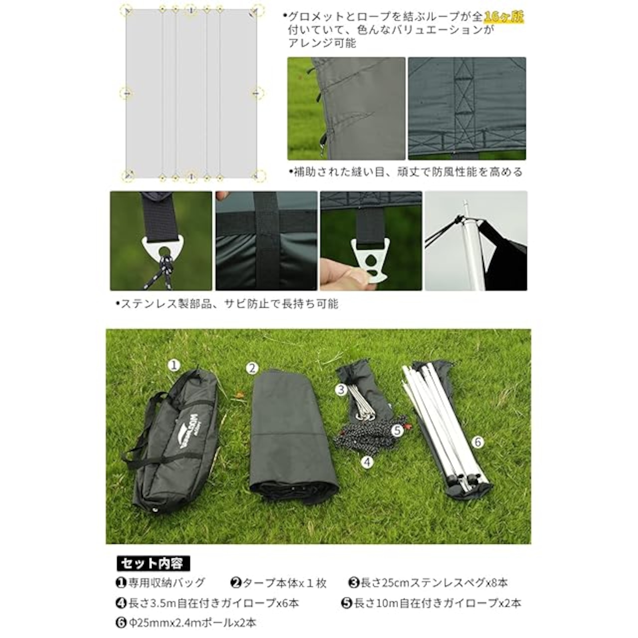 セット内容:タープ本体x1枚、ɸ25mmx2.4mポールx2本、長さ10m自在付きガイロープx2本、長さ6m自在付きガイロープx4本、長さ25cmステンレスペグx8本、専用収納バッグ付きとなっております。