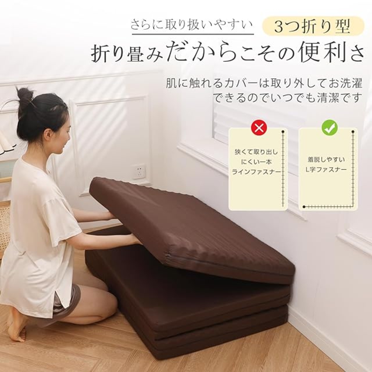 【三つ折り・より長くお使い】片付けや収納に便利な三つ折りタイプで、ラクラク折りたたんで、自立するから家具の隙間に立てて収納します。肩・腰・脚の部分が3分割になっていて、中材の入れ替えが可能です。定期的に入れ替えることでより長くお使いいただけます