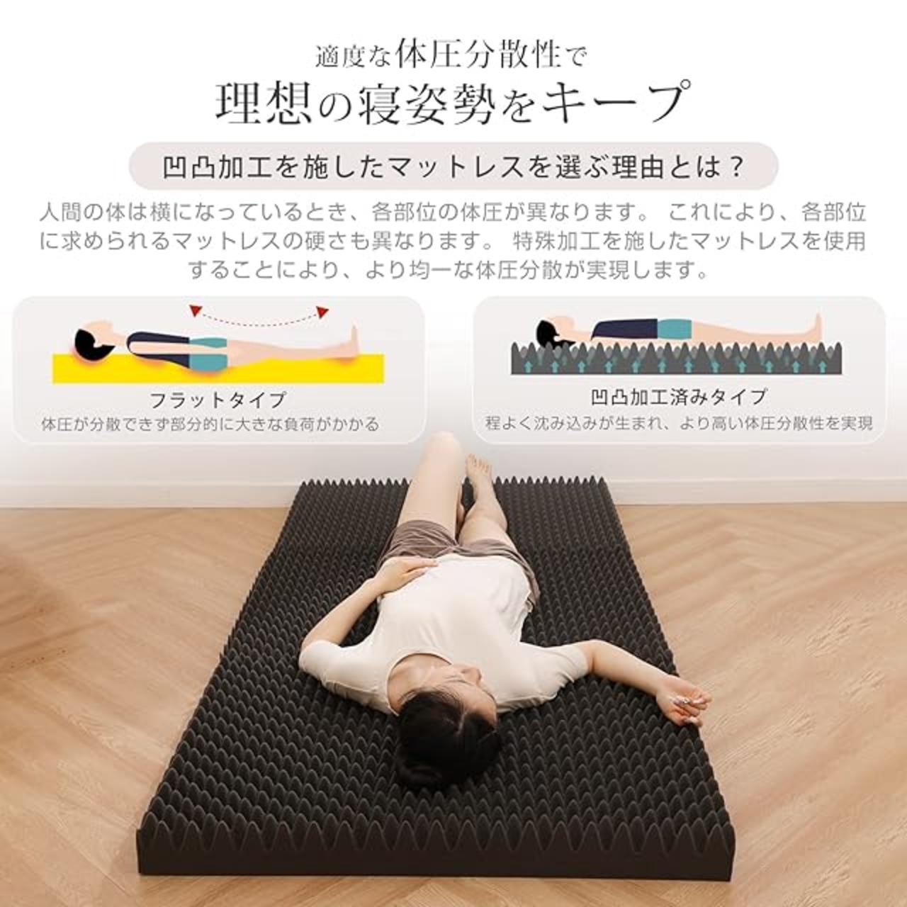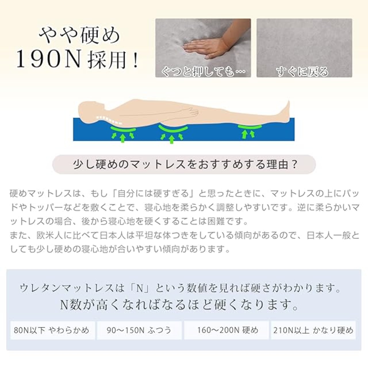 【おこだわりの高反発素材】マットレスを選ぶとき、硬さは最も大事だと言っても過言ではありません。弊社のマットレスは、190Nのやや硬めのウレタンフォームに凸凹プロファイル加工を施して作られており、サポート性と柔らかさを兼ね備えた「ほとんどの人にとって最適な硬さ」に仕上げています