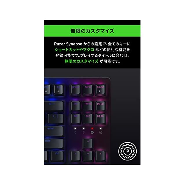 【RAZER イエローメカニカルスイッチ】 RAZER イエローメカニカルスイッチの静音リニアスイッチは、タクタイルバンプのない非常に滑らかなキーストロークを実現し、音を抑える仕様によりさらに静音性を強化しています。