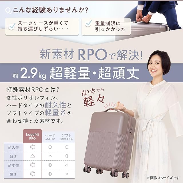 【驚くほど軽量!頑丈ボディ】新素材RPO(変性ポリオレフィン)を使用し、Mサイズの平均重量より約1kgの軽量化に成功しました。RPO素材の特徴であるしなやかさによる「復元力」で強い耐久性・耐衝撃性を実現。徹底した品質テストを実施し、お客様の大切な荷物をしっかり守ります。
