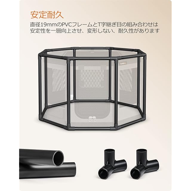 【頑丈安定】犬用サークルはPVCフレームを使用して支えられており、活発な犬が中にいても安定し、変形を防止できます。表面はオックスフォード布とメッシュでできており、丈夫で耐久性があり、傷や噛み付きに強く、通気性も良好です。ペットにより安全な生活環境を提供します