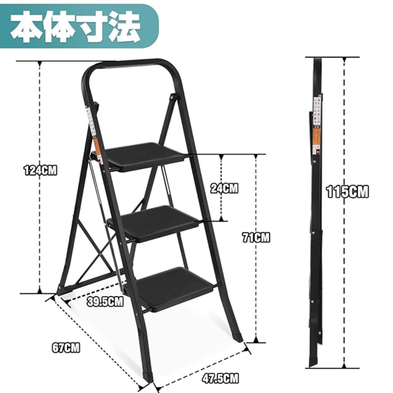 SPIEEK 脚立 鉄素材 持ち運び便利 持ち手付き 軽量 折りたたみ脚立 踏み台 滑り止め付き ステップ台 (ブラック, 三段)