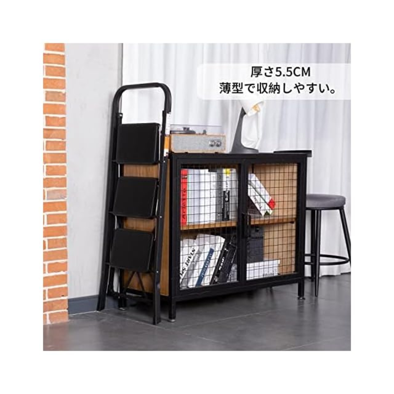 【超省スペース】折りたたみ式脚立。収納時僅か3cmの幅です。折りたたみでき、収納場所も取らず使い勝手が良いです。超省スペースで、どんなコーナーにも収納できます。