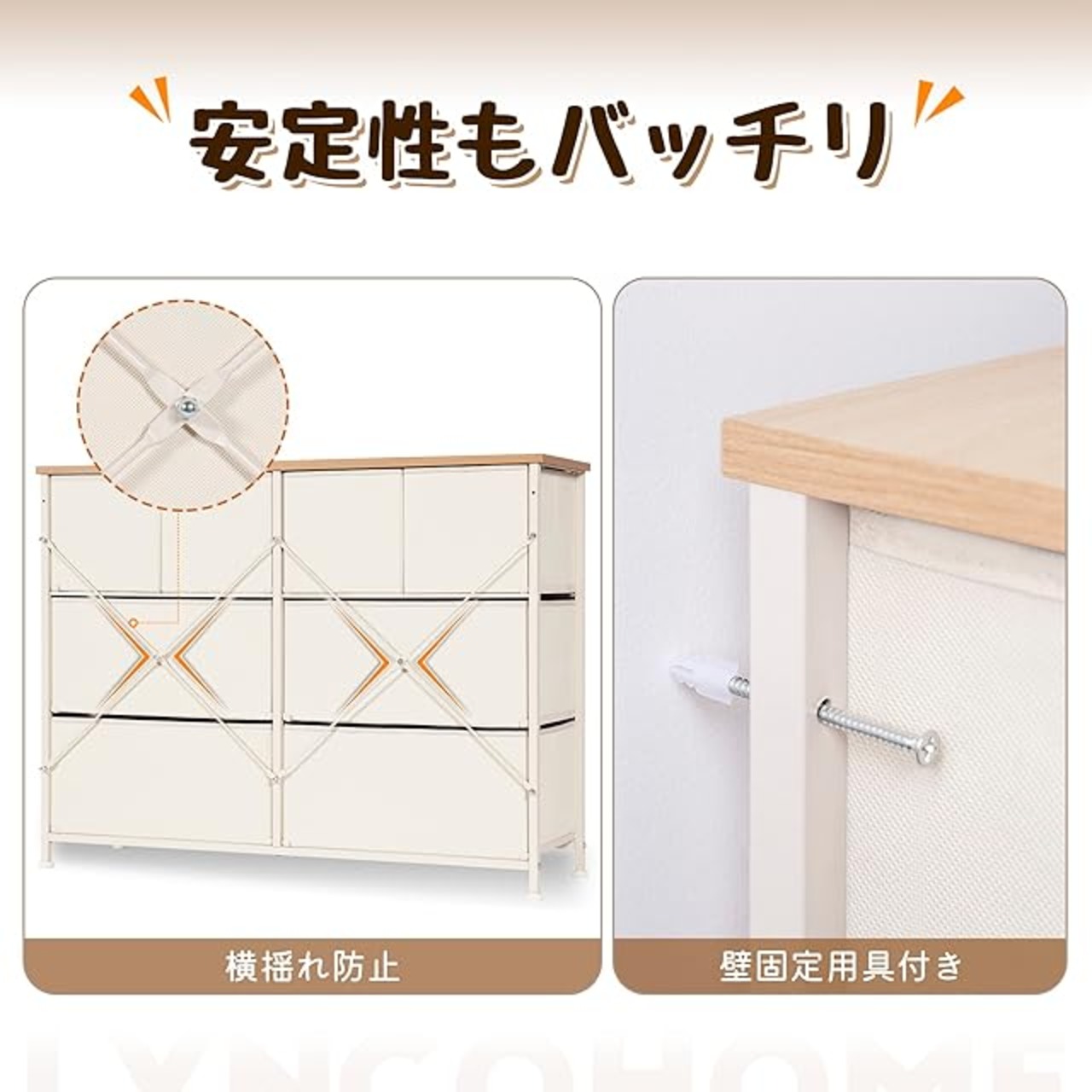LYNCOHOME ベージュ タンス 箪笥 チェスト 布製 おしゃれ 引き出し 衣類収納 可愛い 一人暮らし 大容量 簡単組立 転倒防止 3段8杯【幅100×奥行30×高さ76cm】