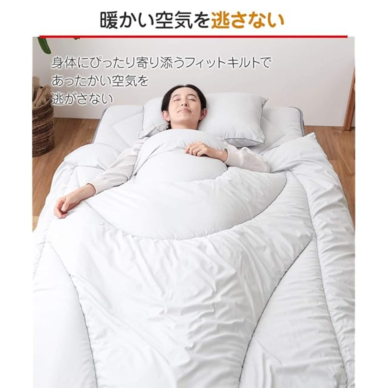 【ニオイもほこりも気にならない合成繊維掛け布団】TEIJIN (帝人)×AQUA 快適清潔シリーズ やわらかフィット掛け布団は動物性素材を使わない合成繊維の掛け布団なので、ほこりが出にくいのもメリットのひとつ。羽毛独特のニオイもなく、ハウスダストに敏感な方にもおすすめです。なかわたは従来の1.5倍とボリュームもたっぷり、さらに身体の線に沿う「フィットキルト仕様」であったかい空気を逃しにくく、保温性にも優れています。オールシーズンお使いいただける掛布団です。