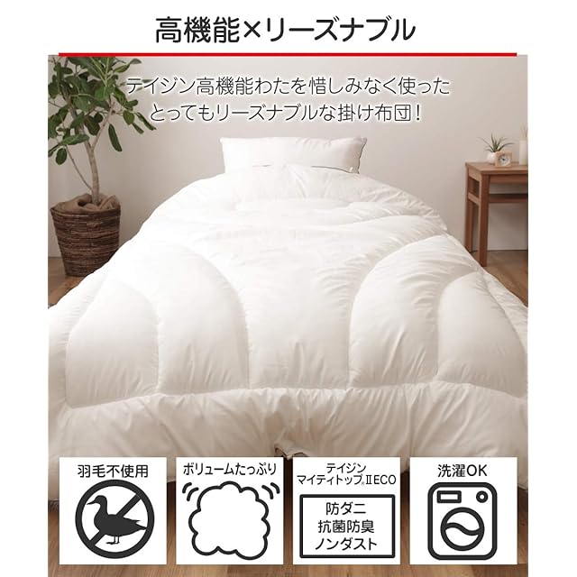 【とことん清潔仕様】洗える掛け布団とは言え、多忙な毎日やお天気のタイミングなどで掛布団を洗いたくてもなかなか洗えないこともありますよね。【TEIJIN (帝人)×AQUA 快適清潔シリーズ】 やわらかフィット掛け布団は、そんな時の心強い味方。帝人の高機能わた「マイティトップⅡeco」を贅沢にも100%使用、菌の繁殖を抑制する抗菌防臭機能、防ダニ機能付きのなかわたでとことん清潔。気持ちよくおやすみいただける掛布団です。(※一般的な掛け布団は、抗菌防臭わた50%程度の仕様です)