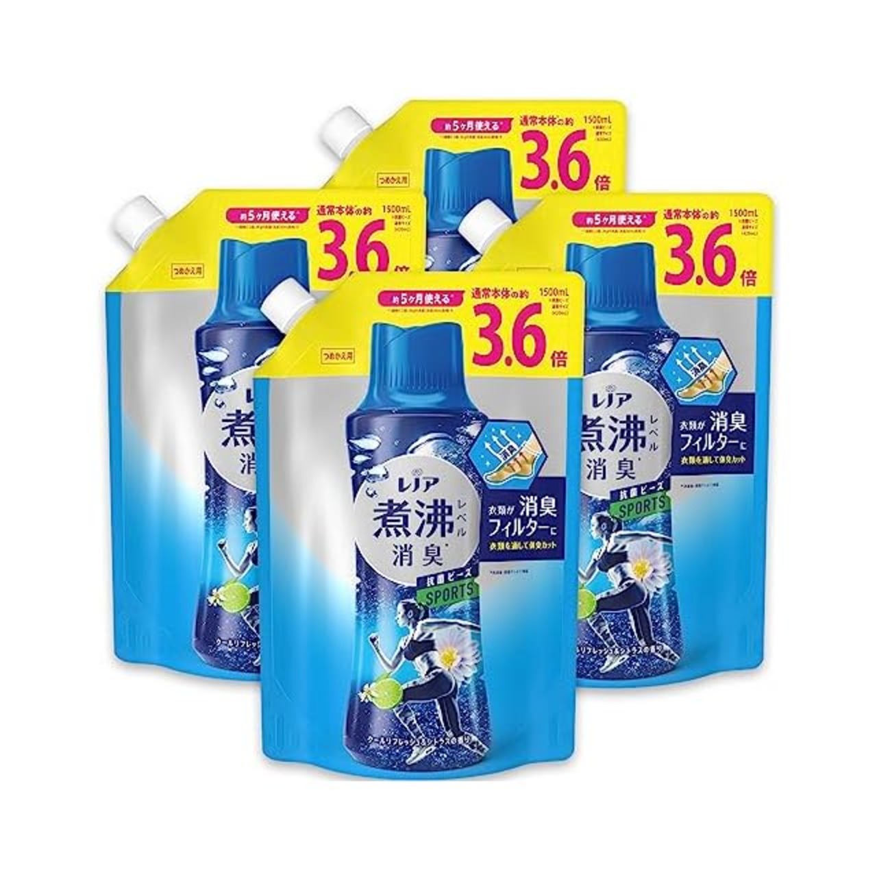 [ケース販売] レノア 超消臭 煮沸レベル消臭 抗菌ビーズ スポーツ クールリフレッシュ&シトラス 詰め替え 大容量 1,500mLx4袋