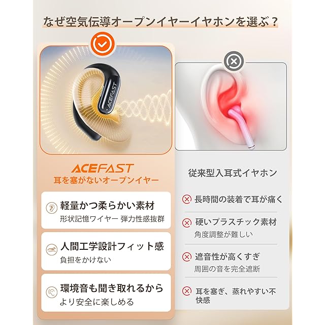 【驚くほど軽く、心耳が喜ぶ心地よさ】 耳を塞がない人体工学設計で、親肌性の柔らかい液体シリコンが耳廓に優しく寄り添い、0.8mmのニッケルチタン合金フレームが自然にフィットしてズレを防ぎます。片耳わずか7.5gの軽量さで、まるで「つけていることを忘れる」ような装着感。長時間つけても疲れ知らず、毎日をもっと快適に。ACEFAST オープンイヤー 日常使いから運動まで、あなたの耳に新しい解放感を!