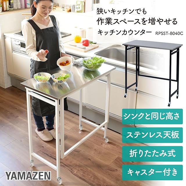 山善(YAMAZEN) テーブル キッチンカウンター 折りたたみ 組立カンタン (ステンレス天板耐熱温度 : 200度) 幅80×奥行40×高さ85cm テーブル ブラック RPSST-8040C(BK) | primer