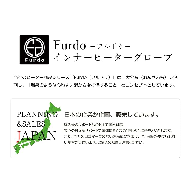 ■【Furdoインナーヒーターグローブ】当社のヒーター商品シリーズの「Furdo(フルドゥ)」は、大分県(おんせん県)で企画し、「温泉のような心地よい温かさを提供すること」をコンセプトとしています。■【安心】安心して商品を使用していただけるように、本体・付属品の検品・チェックなど大分県の工場で行っております。■【7.4Vハイパワーで温かい】従来品では3.7Vのところを、7.4Vのバッテリーを使用。速暖性にも優れ、約10秒で温かさを感じられるように設計しています。