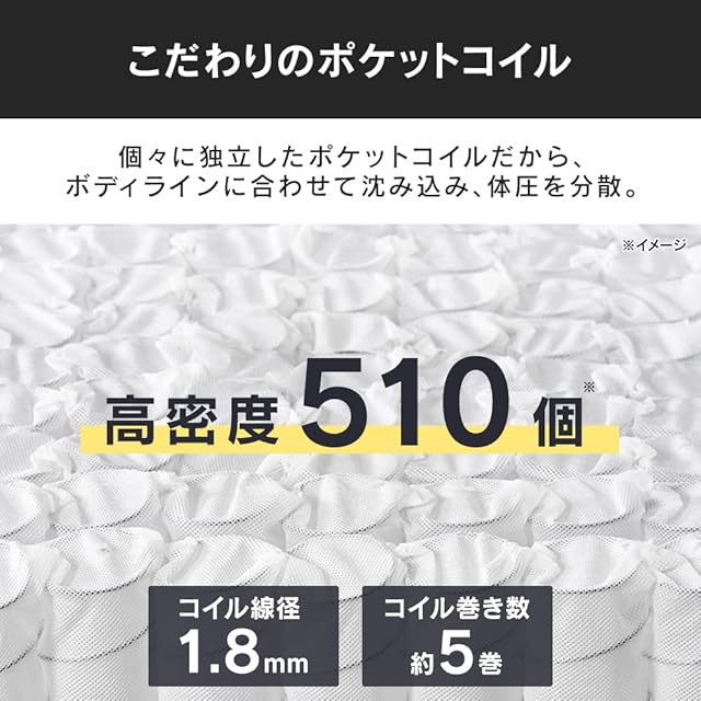 材質 側生地/表・サイド:ポリエステル100%、裏:不織布(ポリプロピレン100%)、充填物:ポケットコイル、ウレタンフォーム