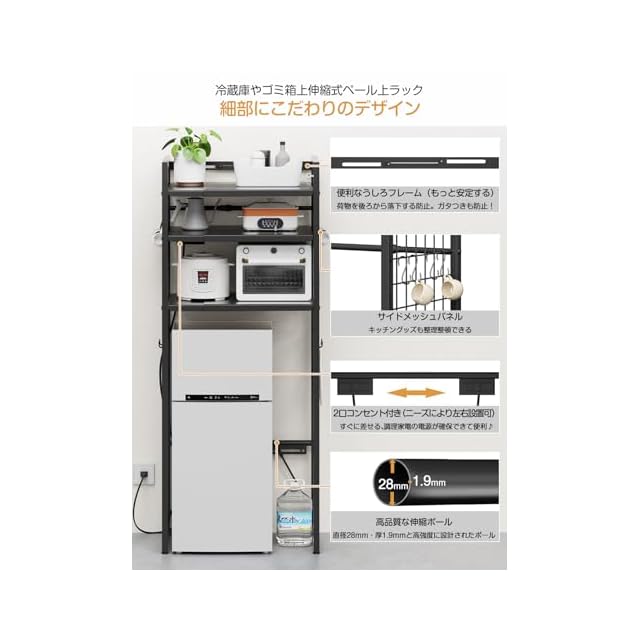 【2口コンセント付き】レンジやトースターなどの電源を確保でき。複数の家電を設置する可能です。※コンセントは家電により左右設置可能。合計で1500ワットまで使えます。 【便利なうしろフレーム(もっと安定する)】荷物を後ろから落下する防止。ガタつきも防止! 【サイドメッシュパネル】キッチングッズも整理整頓できる。 【高品質な伸縮ポール】直径28mm・厚1.9mmと高強度に設計されたポール、さらに長く使える。